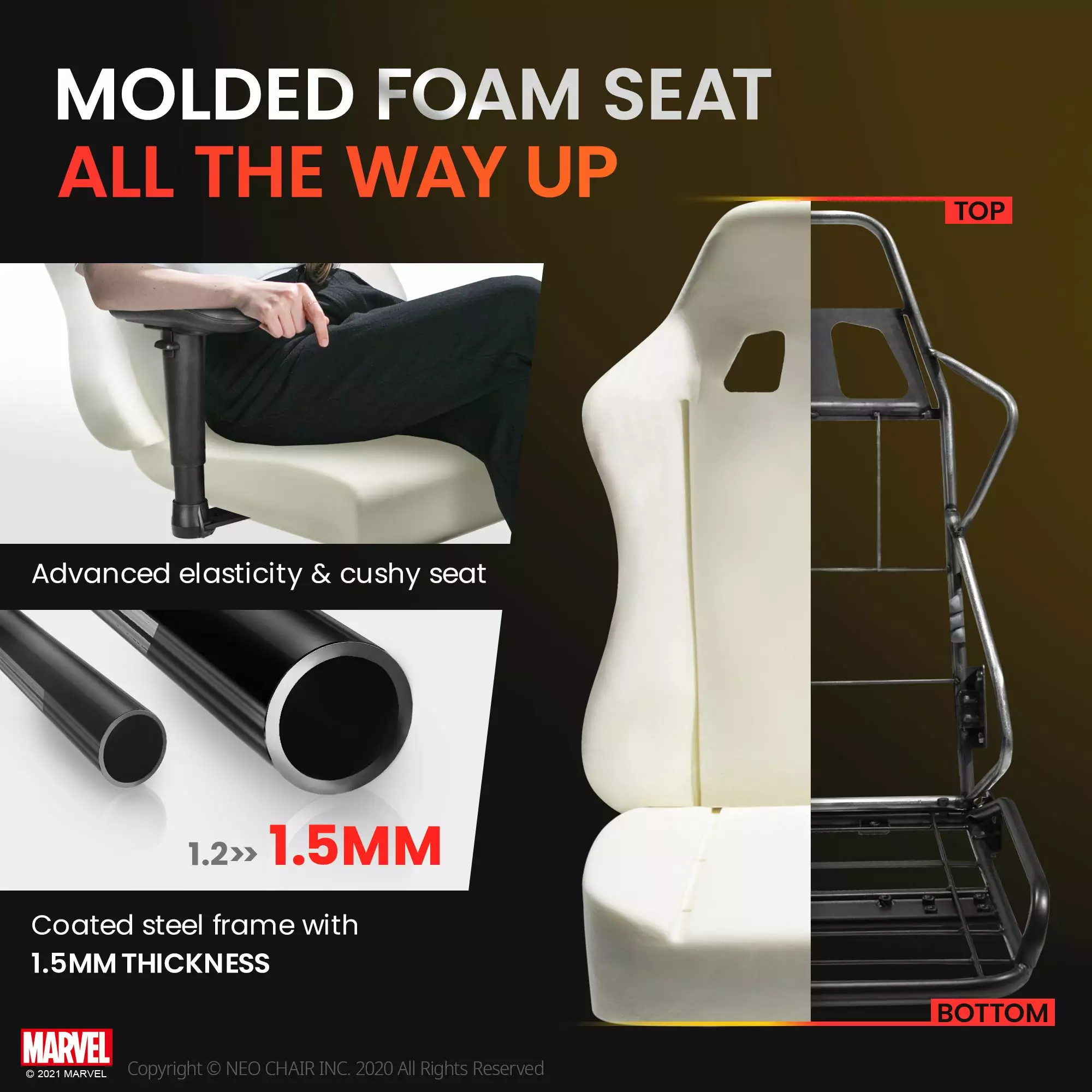 Ergonomically designed for lasting comfort and manufactured with 1.5mm steel frames to support you for 10 years. With our design officially licensed by MARVEL, our chairs are high quality gaming chairs that passed the rigorous BIFMA standards.